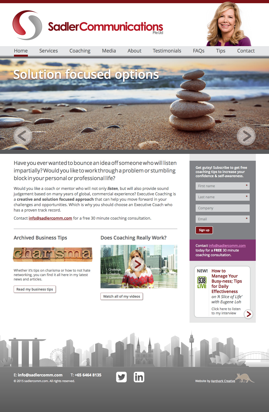 Next, we set up an email newsletter template for Susan's coaching tips, and provided training via Skype (as she is based in Singapore) to enable her to produce future editions herself. Whenever a coaching tip email is sent out, it is automatically added to the website, saving Susan time.